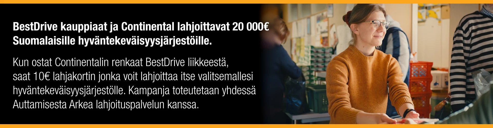 Kun ostat Continentalin renkaat BestDrive liikkeestä, saat 10€ lahjakortin jonka voit lahjoittaa itse valitsemallesi hyväntekeväisyysjärjestölle.