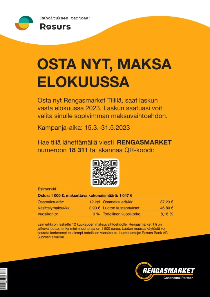 Esimerkkiostos: 1 500 €, 12 kk maksuvaihtoehdolla. Vuosikorko: 0 %. Luottokulu/kk: 5,60 €. Todellinen vuosikorko: 4,01 %. Luoton kustannukset: 61,60 €. Maksettava yhteensä: 1 561,60 €. Osamaksuerä/kk: 130,60 €, 12 erää. Best Drive Tili on jatkuva luotto, jonka minimiluottoraja on 2 000 €. Luoton muusta käytöstä voi seurata korkeampi tai alempi todellinen vuosikorko. Luotonantaja: Resurs Bank AB Suomen sivuliike.